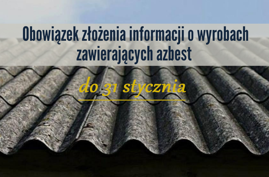 Przypominamy, że zgodnie z obowiązującymi przepisami właściciele nieruchomości, na której znajdują się wyroby zawierające azbest mają obowiązek złożyć „Informację o wyrobach zawierających azbest” w terminie do 31 stycznia 2026 r.