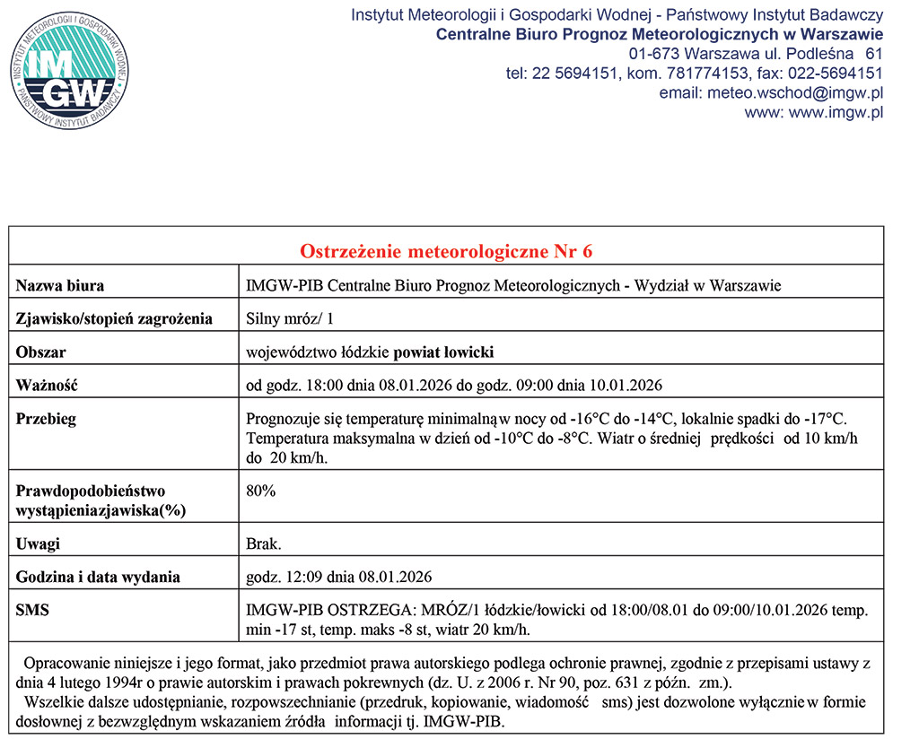 Ostrzeżenie meteorologiczne Nr 6 – Silny mróz